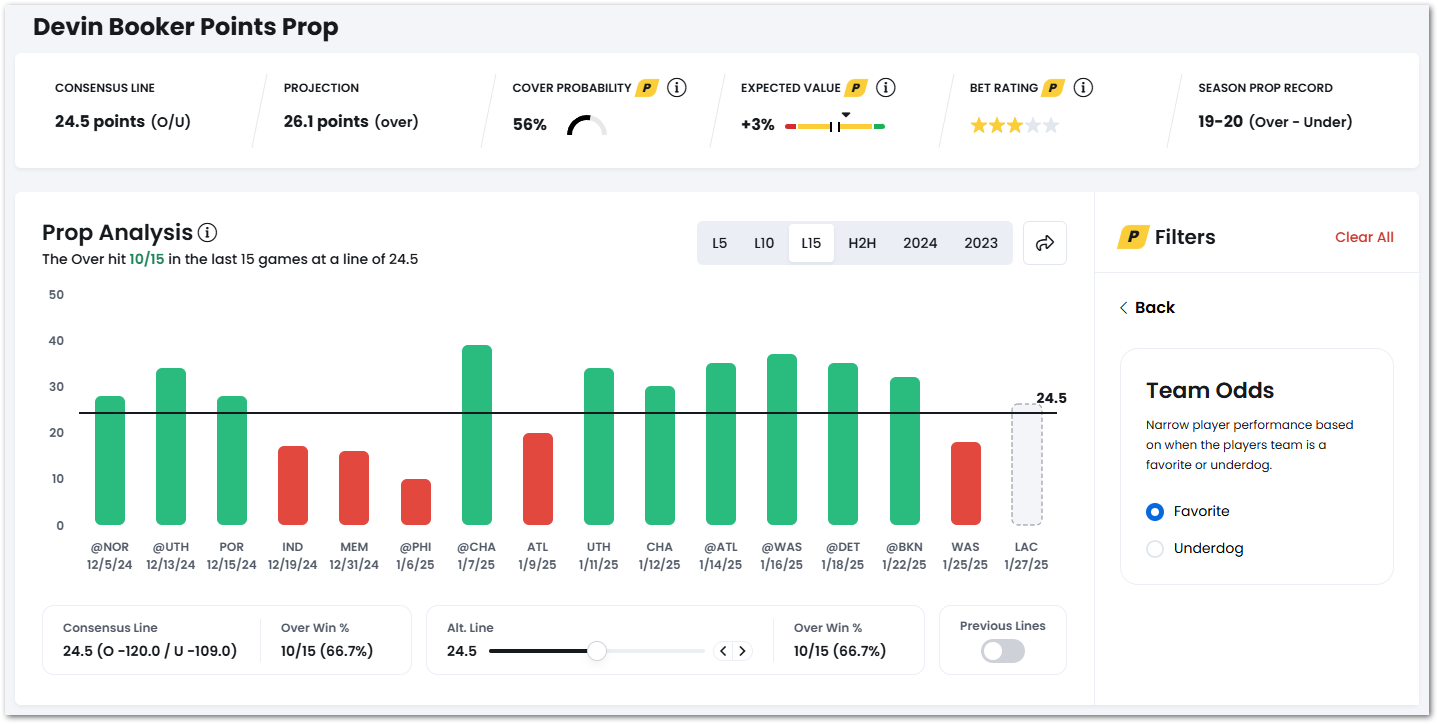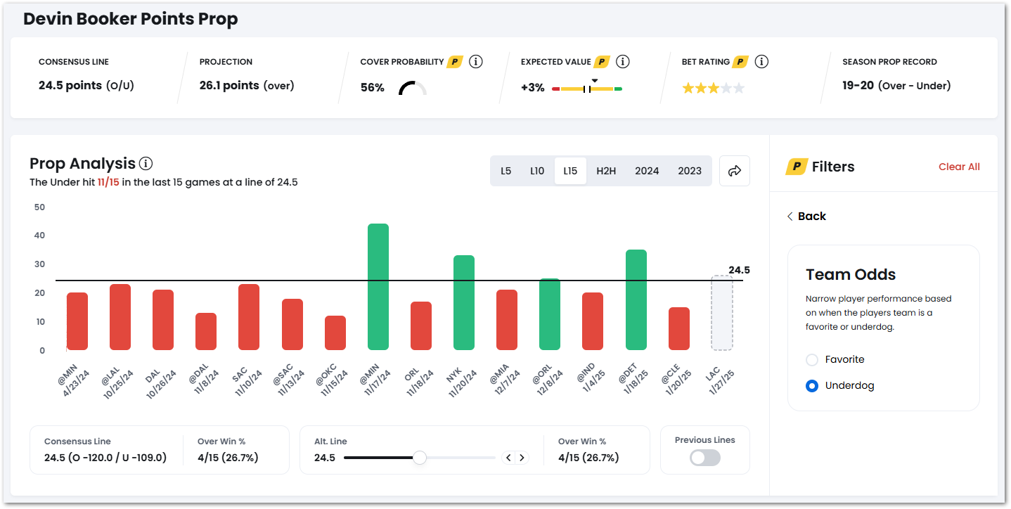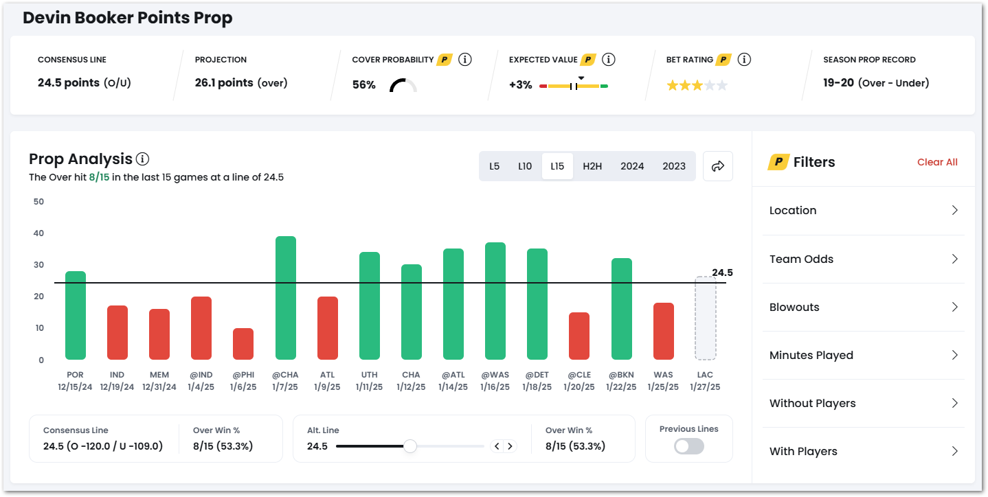 For example, Devin Booker's Points prop is pretty much even at a line of 24.5, having gone over in 8 of his last 15.