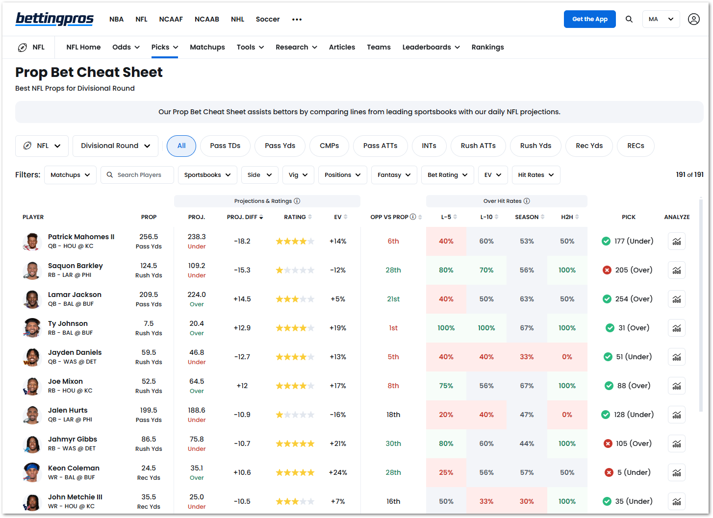 Hit Rates are now front and center in the Prop Bet Cheat Sheet. We've added hit rates across recent matchups, for the season, and in head-to-head matchups.